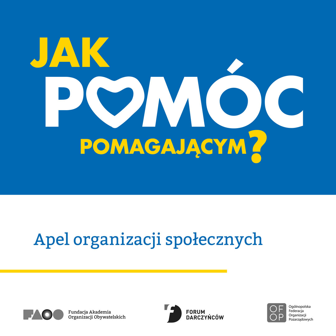 Fundacja Akademia Organizacji Obywatelskich, Forum Darczyńców w Polsce oraz Ogólnopolska Federacja Organizacji Pozarządowych – przy wsparciu ponad 70 organizacji społecznych – apelują o regularne wpłaty na rzecz organizacji i przypominają, na co zwrócić uwagę, przekazując dary rzeczowe. Zachęcają przy tym do skorzystania z zestawu wskazówek dla darczyńców „Jak pomóc pomagającym?”.